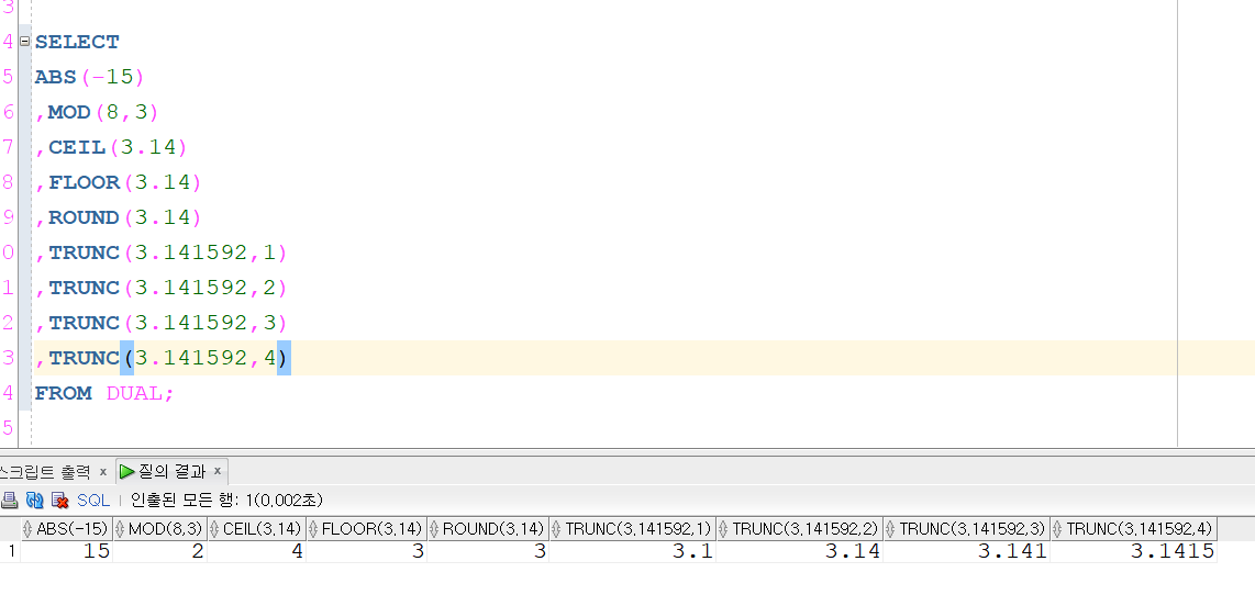 유용한 함수 숫자형 함수 /ABS() ,MOD() ,CEIL(), FLOOR() ,ROUND() ,TRUNC(),/SQL-ORACLE 본문