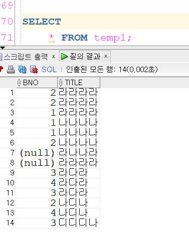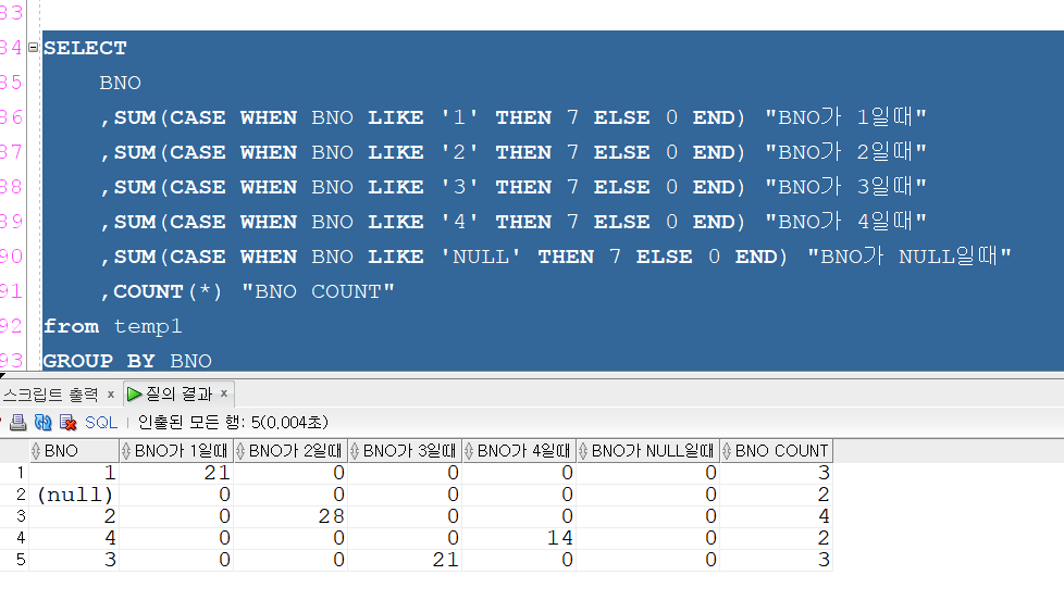 ,SUM(CASE WHEN BNO LIKE 'NULL' THEN 7 ELSE 0 END) "BNO가 NULL일때"