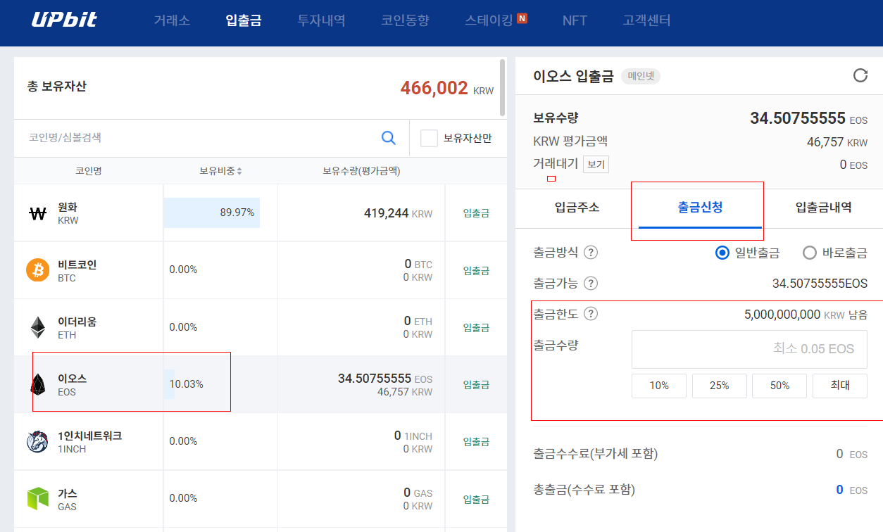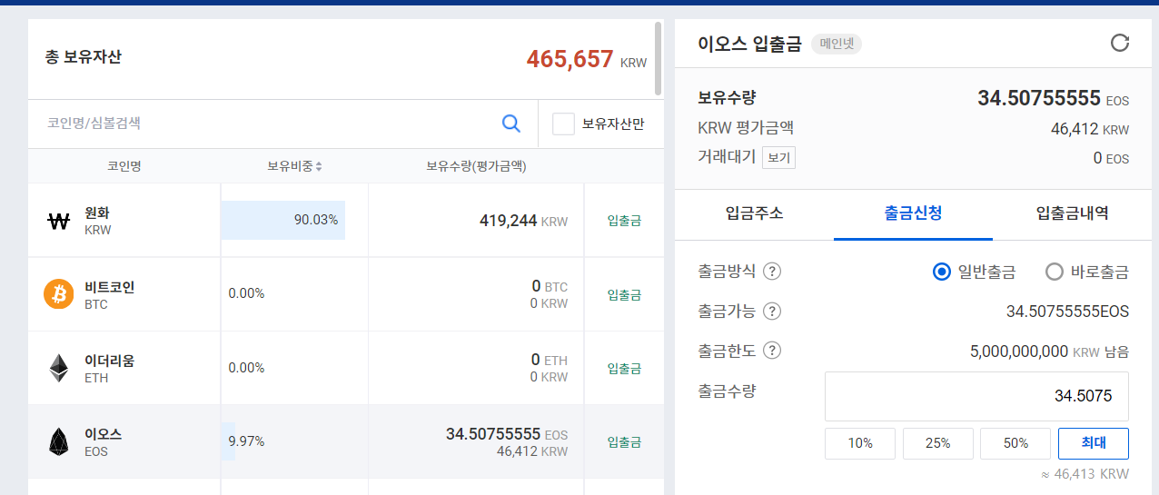 출금 신청에서 내가 가지고있는 이오스 수량을 선택한후 밑에 확인 버튼을 누른다