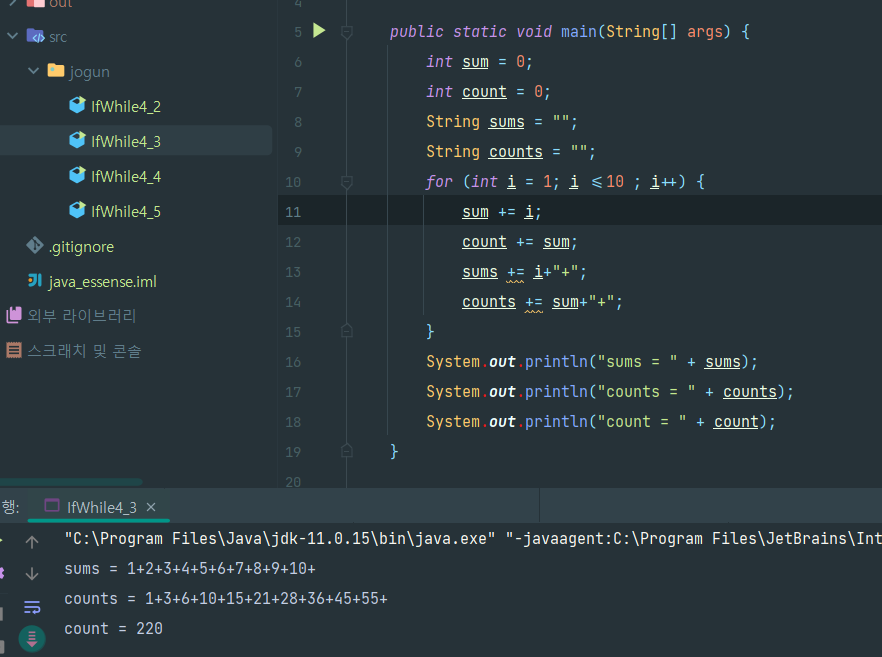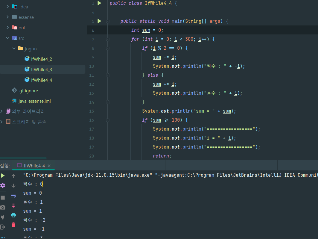 자바의 정석 연습문제 / 4-2 나눗셈 , 총합구하기 / 4-3 규칙적인 총합 구하기 / 4-4 총합이 100 이상 되는 숫자 구하기 본문