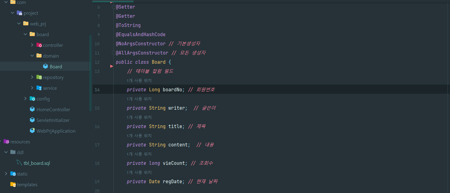 이렇게 테이블을 만들었으면 테이블에 맞게 자바 class 도 만들어보자 ~