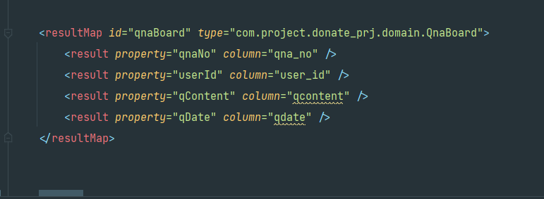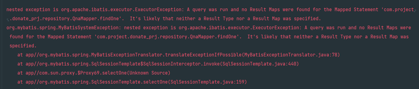 org.mybatis.spring.MyBatisSystemException: nested exception is org.apache.ibatis.executor.ExecutorException: A query was run and no Result Maps were found for the Mapped Statement 'com.project.donate_prj.repository.QnaMapper.findOne'. It's likely that neither a Result Type nor a Result Map was specified.