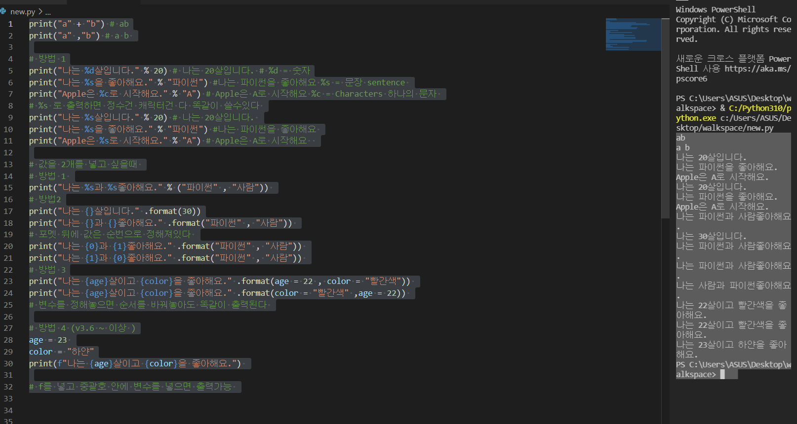 print("나는 %s과 %s좋아해요." % ("파이썬" , "사람"))