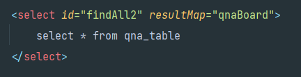 id 부분엔 내가 사용하는 mapper 안에 이름이 findAll2 라는메서드와 이름을 매칭시켜준다