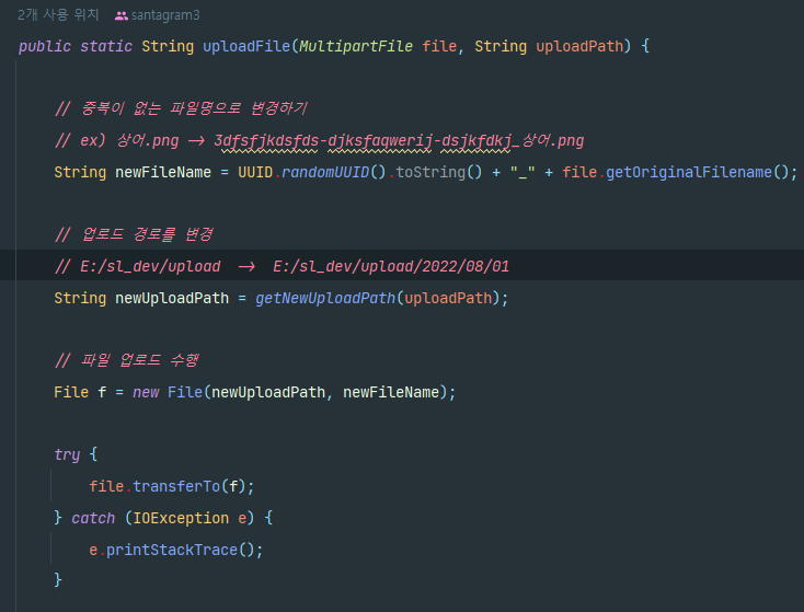 파일 정보와 , 파일을 저장할 경로를 넣어주면 저장해주는 메소드를 만들었다