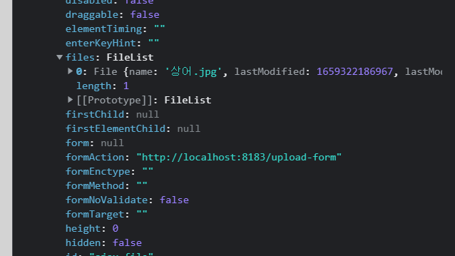 파일인풋에서 - 파일즈 에 들어가면 0번째에 상어.jpg 가 들어있는걸 볼수 있다 !