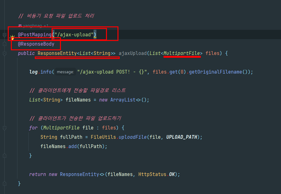 3. 파일을 받았기 때문에 MultipartFile 을 써서 파일에 대한 정보를 받을것!