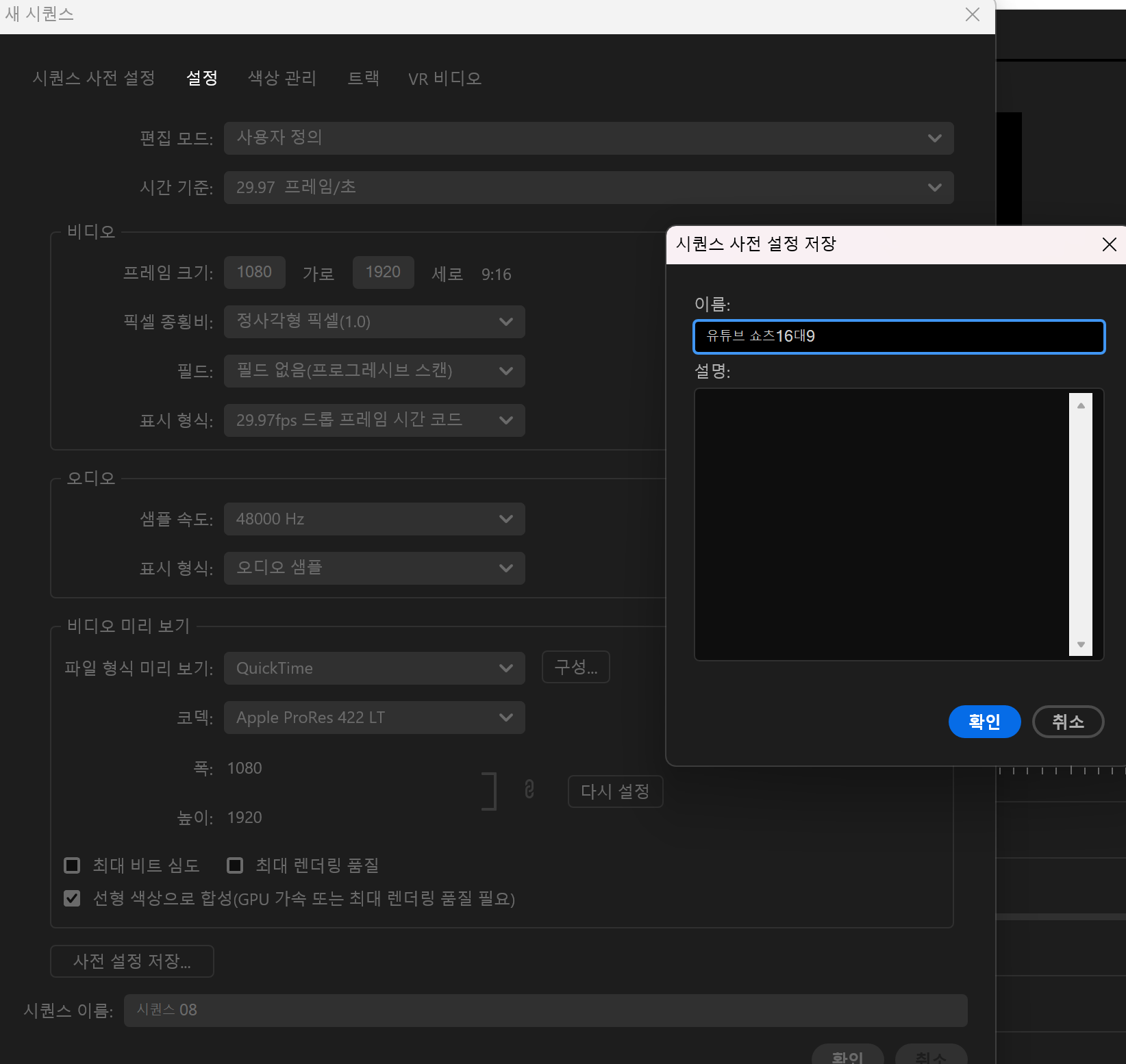 12. 사전 설정 저장 > 이름 : 유튜브 쇼츠 16대9