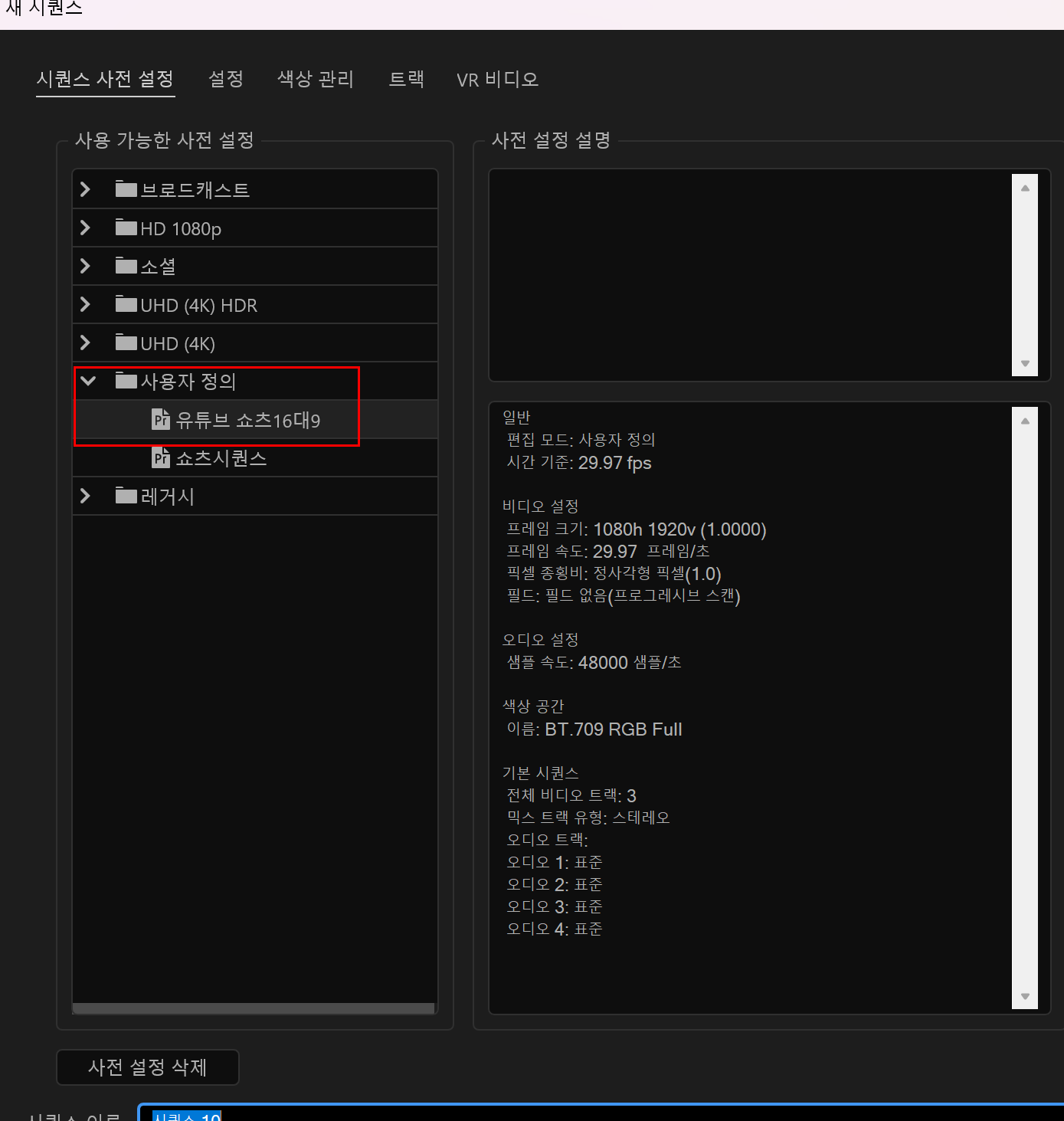 5. (왼쪽 위에) 시퀀스 사전 설정 창에서