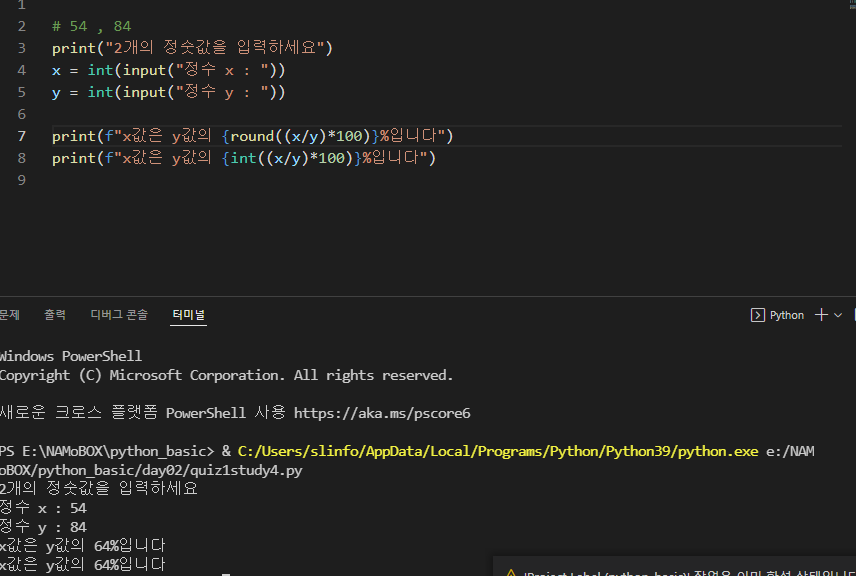 print(f"x값은 y값의 {round((x/y)*100)}%입니다")