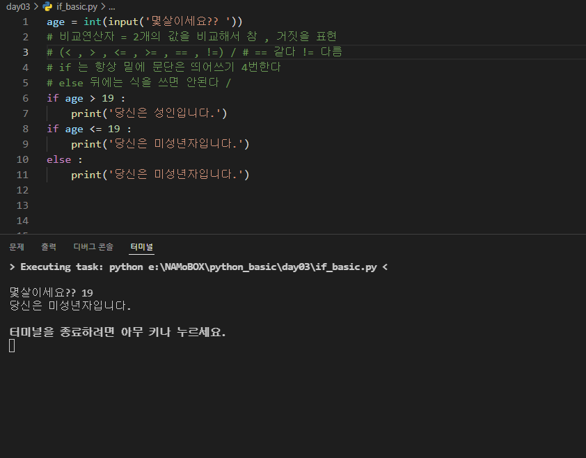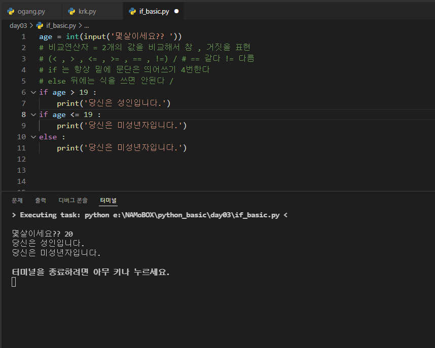 if : , 비교 연산자 , else : , print() ,/ (< , > , <= , >= , == , !=) / # == 같다 != 다름 /2022.03.31(목) / python , 파이썬 / 비교연산자 / 성인비교 본문
