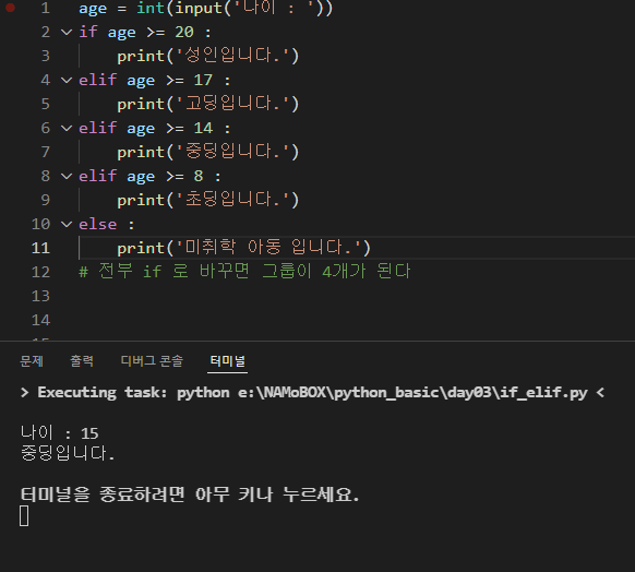 2. if 맨처음 줄에 숫자가 너무 작아버리면 맨처음 결과만 나옴 나이가 어려도 성인으로 출력이 된다