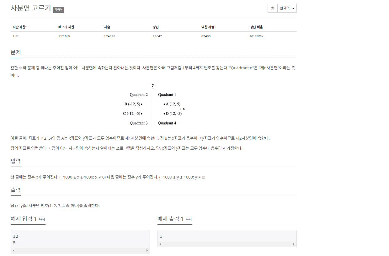 백준 코딩테스트 14681번 사분면 , Quadrant , 좌표 / int(input()) , input() , < , > , if , elif , 2022.04.04 (월) . python , 파이썬 / 본문