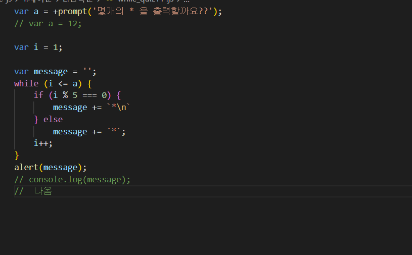 * 구하기 , 5개마다 칸 나누기 / if , i % 5 ===0 , while/ 자바스크립트 ,javascript 본문