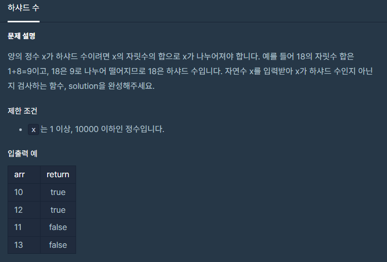 // 예를 들어 18의 자릿수 합은 1+8=9이고, 18은 9로 나누어 떨어지므로 18은 하샤드 수입니다.