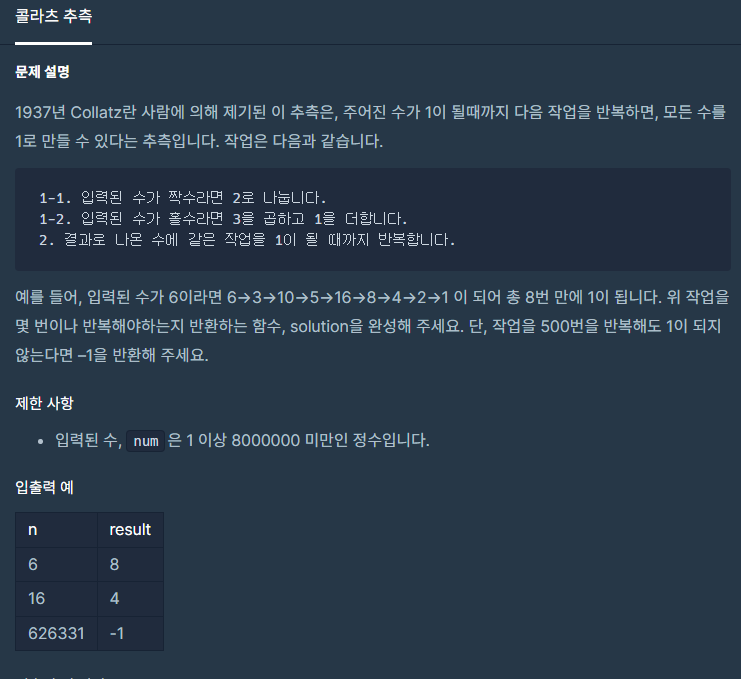콜라츠 추측 / level 1 / java / 코딩테스트 , 코테 , 적성검사 /프로그래머스 / programers 본문