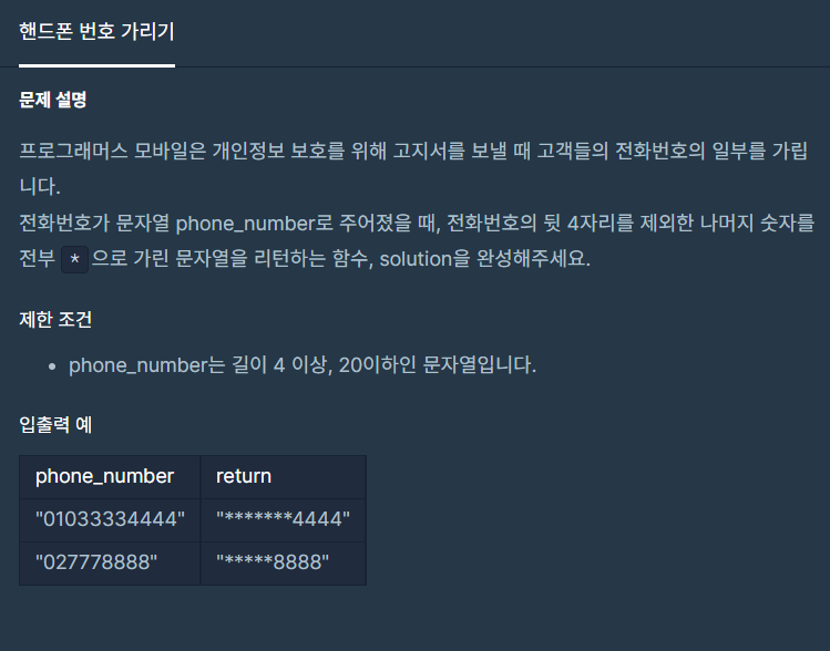 핸드폰 번호 가리기 / level 1 / java / 코딩테스트 , 코테 , 적성검사 /프로그래머스 / programers // 코드해석 , 주석