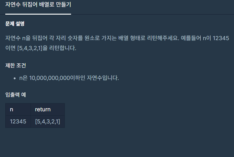 자연수 뒤집에 배열로 만들기 / level 1 / java / 코딩테스트 , 코테 , 적성검사 /프로그래머스 / programers // 코드해석 , 주석 본문
