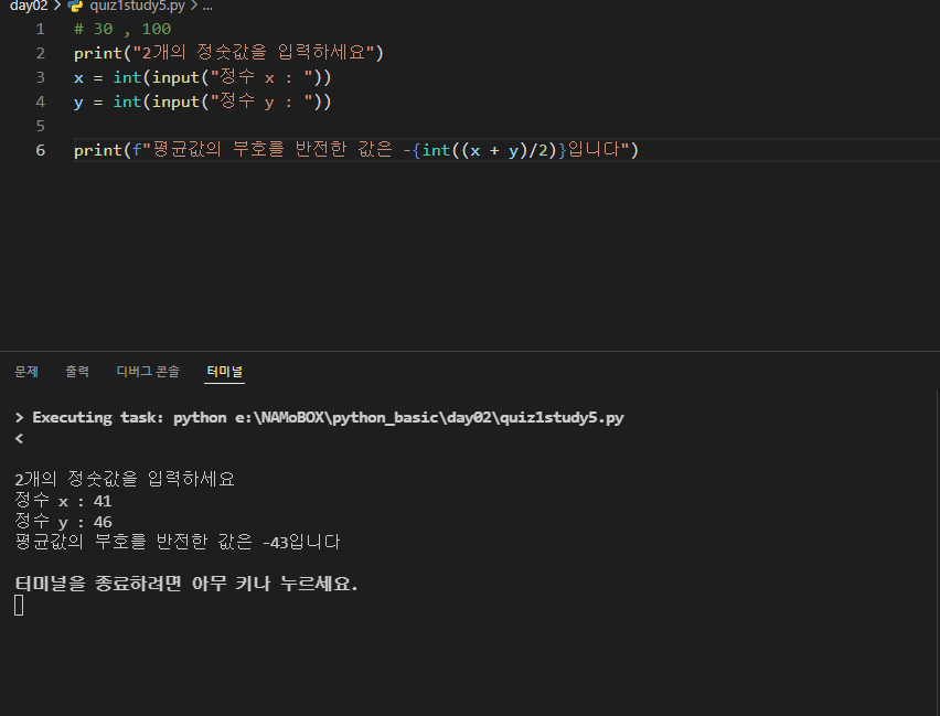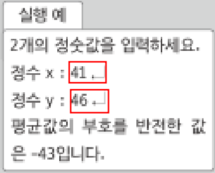 print(f"평균값의 부호를 반전한 값은 -{int((x + y)/2)}입니다")