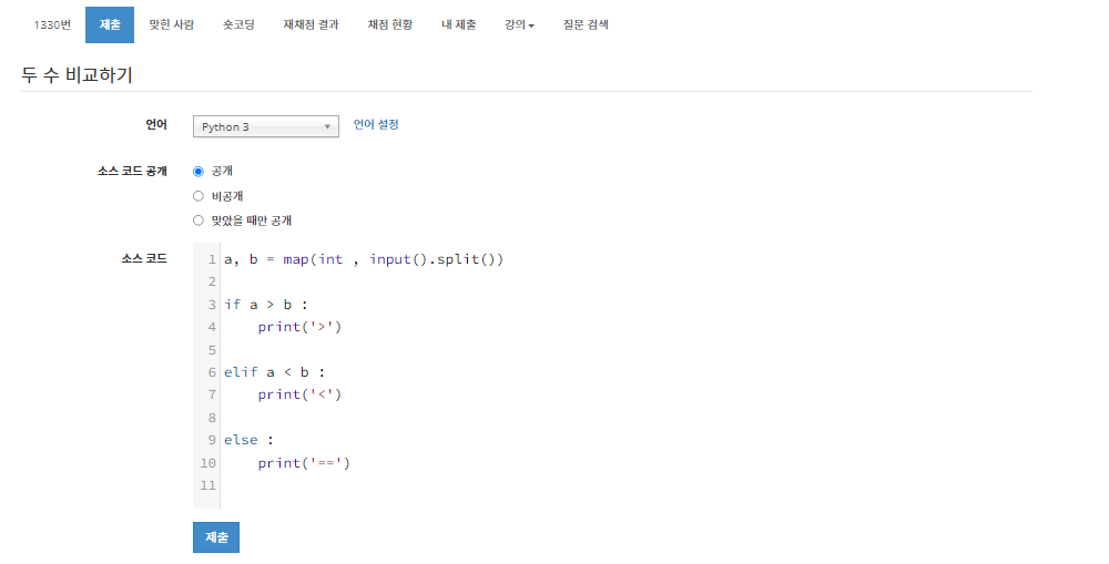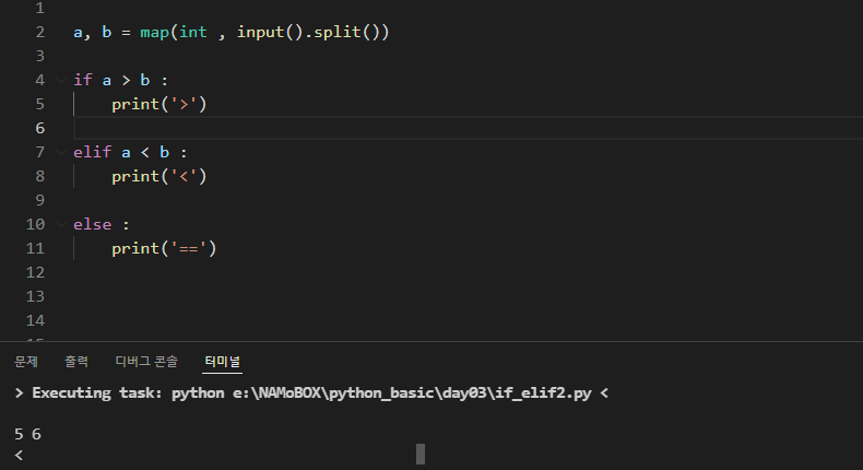 1330번 백준 코딩테스트 /, a, b = map(int , input().split()) ,if ~ elif , else / 2022.03.31 (목) / python , 파이썬